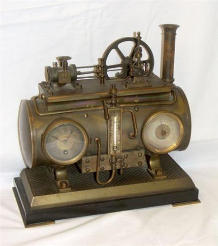 Belle pendulette industrie en marbre et bronze représentant une locomotive avec l'horloge, le baromètre et le thermomètre et avec un mouvement supplémentaire qui fait marcher la machine à vapeur, époque 1900
