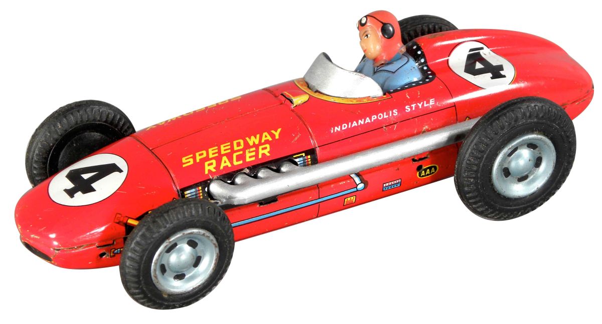 Speedway Racer Tin Toy Car. Indy Style #4, several sponsors. Some light surface scratches otherwise good condition. 6 1/2 inches long.