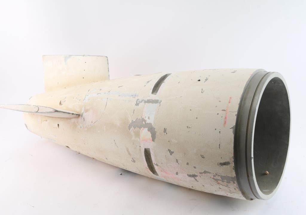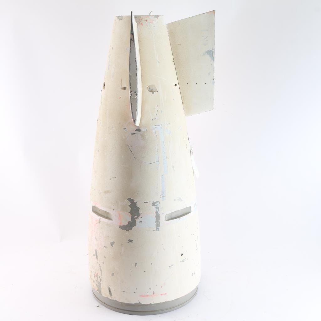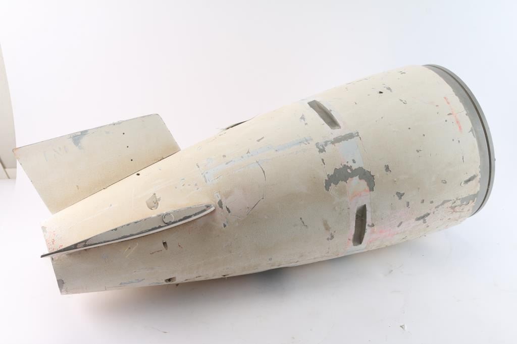 White colored tail section missing one fin. Possibly from MK70 or MK80 Series Bomb. Measures: 31" OAL, 15"dia. fin tip, 5" dia. end & 12" dia. body.