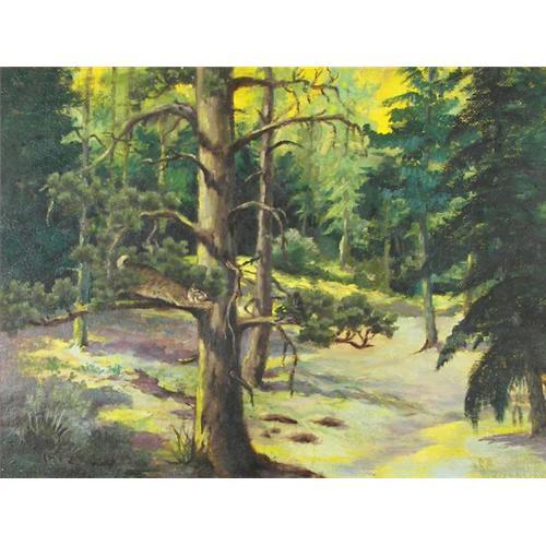 Inez Tatum, Oil on Board, Bobcat in Treed Landscape, 18" x 24" signed lower left