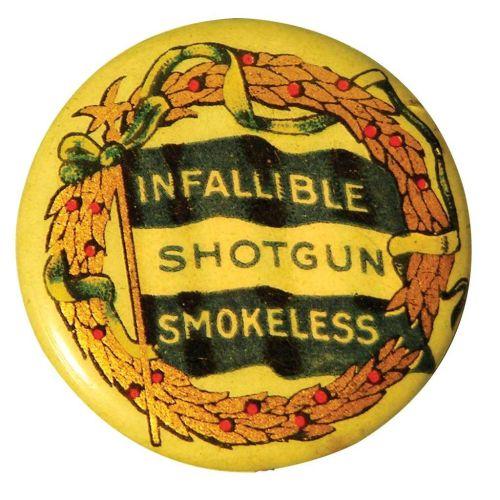 Celluloid Pinback advertising Infallible Shot Gun Smokeless Gun Powder. Excellent condition. 1 inch diameter.