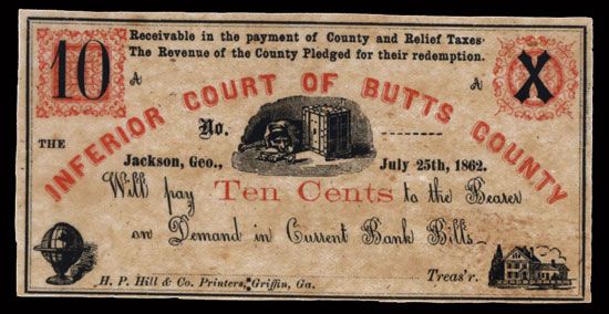 Jackson, Georgia, July 25th, 1862, 10 Cents, Unlisted, Issued obsolete scrip note, dog by safe in middle, globe LL and building LR, Black on red underprint, Unissued, there appears to be a light horizontal fold but it may be a preprinting paper inclusion, otherwise the note appears Choice XF to AU with nice large margins and a fresh crisp appearance, scarce note in high grade.