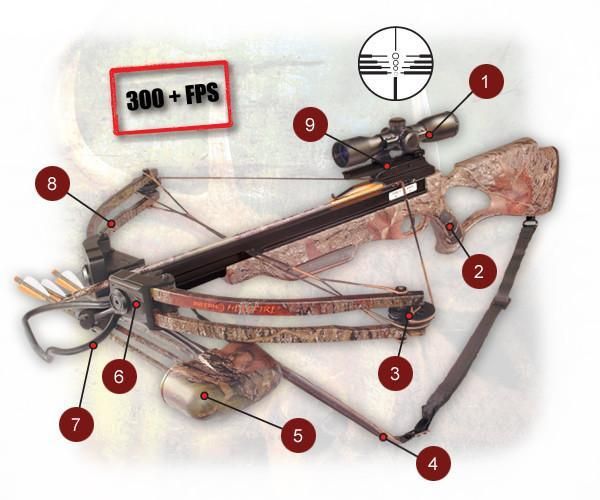 QUICK SPECS Speed: 300FPS Physical Weight: 7.48lbs Length: (w/o Foot Stirrup) 36.5" Width: (Limb Tip to Limb Tip) 27.5" String Length: 37.6" Limbs: Compression Fiberglass Track/Barrel: Extruded & Machined Aluminum Riser: CNC Machined Aluminum Suggested Bolts: 20" Carbon / 100 Grain Tip (included) 20" Aluminum (2219) / 125 Grain Tip Anti Dry Fire: YES