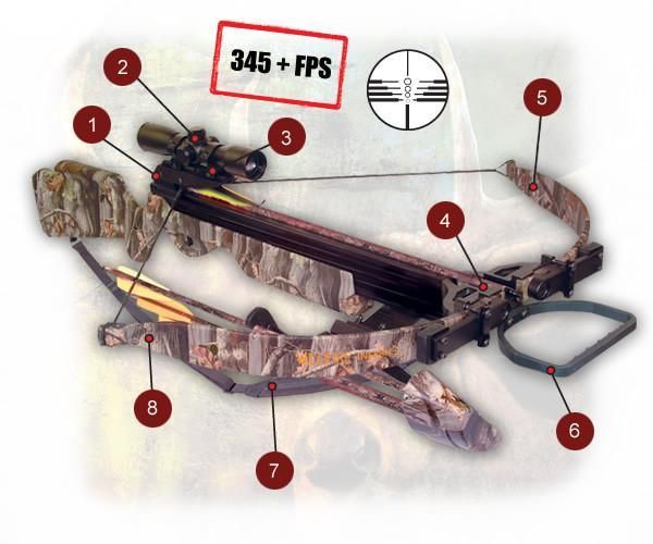 Inferno Wildfire II precision recurve crossbow QUICK SPECS Speed: 345+FPS Physical Weight: 7.3lbs Length: 39.5" (w/o Foot Stirrup) Width: 36.2" (Cocked) String Length: 35.5" Limbs: Special Alloy Track/Barrel: Extruded & Machined Aluminum Riser: CNC Machined Aluminum Suggested Bolts: 20" Carbon / 100 Grain Tip (included)