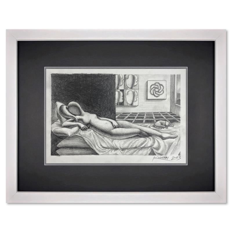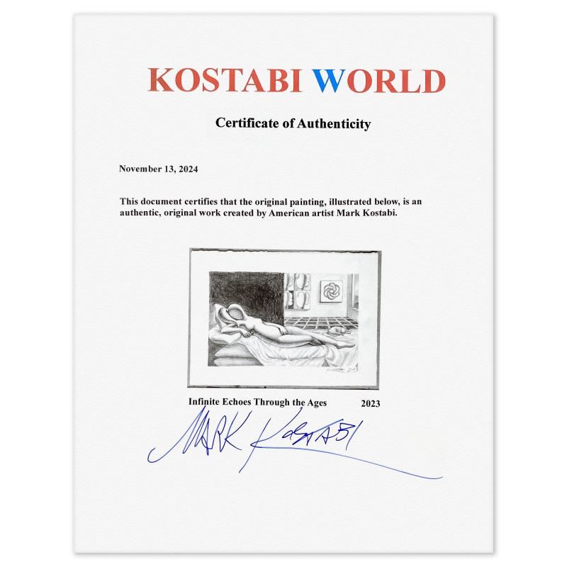 "Infinite Echoes Through the Ages" is an original drawing on paper by Mark Kostabi, hand signed by the artist. This piece comes custom framed. Includes Certificate of Authenticity. Measures approx. 15" x 18.5" (frame), 9" x 12.5" (image). This item requires special handling and may have a longer than usual turnaround.