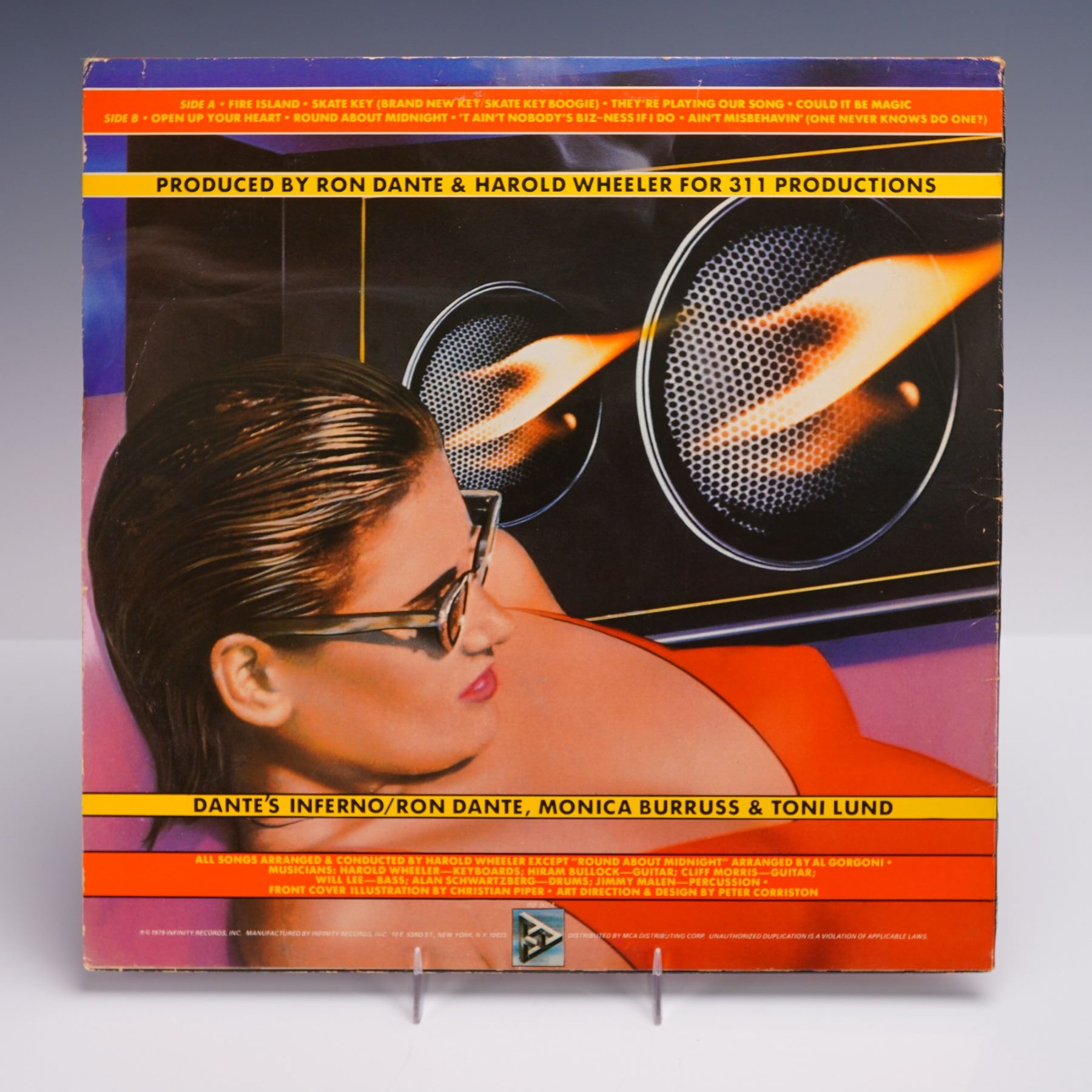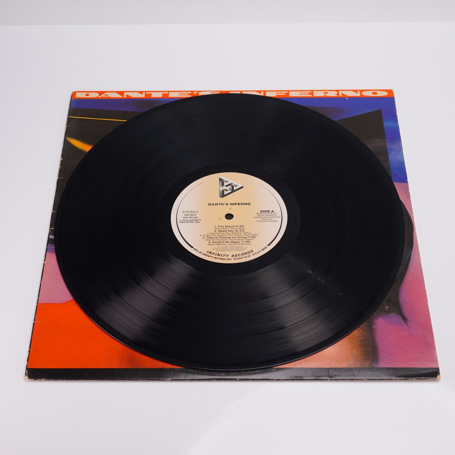A 1979 stereo pressing of the self-titled album "Dante's Inferno," released by Infinity Records. Produced by Ron Dante and Harold Wheeler for 311 Productions, this disco era LP features a vibrant blend of original compositions and standards reinterpreted through orchestral pop and soul-infused arrangements. Tracks include "Fire Island," "Skate Key (Brand New Key Skate Key Boogie)," "They're Playing Our Song," "Could It Be Magic," and a rendition of "Ain't Misbehavin' (One Never Knows, Do One?)." The jacket presents a stylized image of a woman in sunglasses reclining before a flaming speaker system, designed with dramatic surrealism and bold color contrasts. The reverse mirrors the front's aesthetic and displays full track listings and production credits. The vinyl itself features the Infinity Records cream colored label.