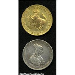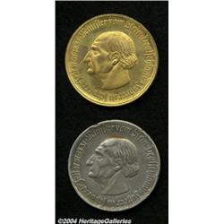 <B>Inflation Coinage,</B></I> Jaeger-N20 10,000 Mark 1923 BU and Jaeger-N29 Zwittermedaille VF with scratches and rim nicks. 2 coins <BR><BR><B>Important notice:</B> Heritage usually auctions material at the rate of 200-250 lots per hour. On some occasions eBay Live bid software or the Internet may not be able to keep up with the pace of the auction. We recommend placing a realistic absentee bid now as insurance to avoid disappointment. Occasionally the auctioneer may eliminate or reject an eBay Live bid, and the auctioneer may also reopen a lot after the close of the eBay live bidding (usually because we missed an audience bid), and may reject your bid even if it shows you as the winning bidder. By bidding via eBay Live, you agree that Heritage may award the lot to another bidder at its sole discretion under the circumstances described above or any other reasonable circumstances. Since eBay bids are not shown to us until we open the lot on the floor, we treat those bids just like floor bids. In most cases the floor responds before the eBay bid is presented to us, due to Internet lag time, so for consistency we have made it a policy that floor bids are always considered first over tie eBay live bids. Also please note that all Heritage lots purchased through eBay Live carry a 20% Buyer's Premium. Please make sure you read the Terms and Conditions before you bid.