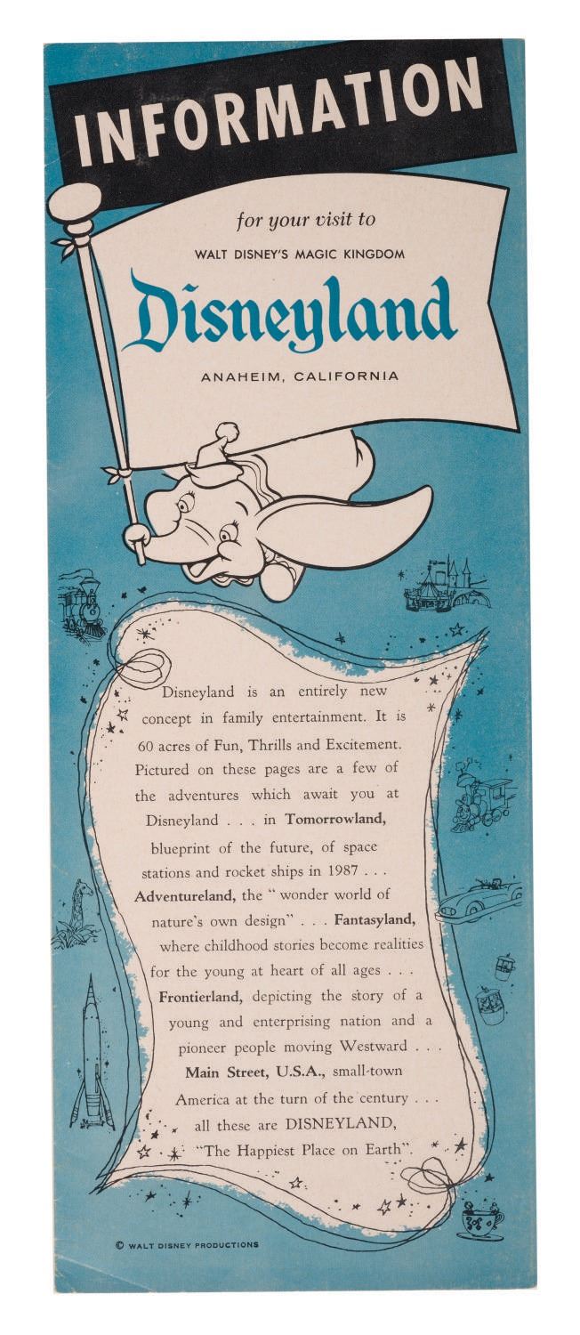 (Disneyland, 1958) An "Information For Your Visit to Disneyland" Gate Fold-out. The colorful pictorial features (10) highlights of your tour through Disneyland (including the Viewliner), with information about hours, cost, and accommodations, and public transportation. Measuring 4"x10.5" folded, the brochure is in very good condition with a few creases and minor wear to edges and corners.