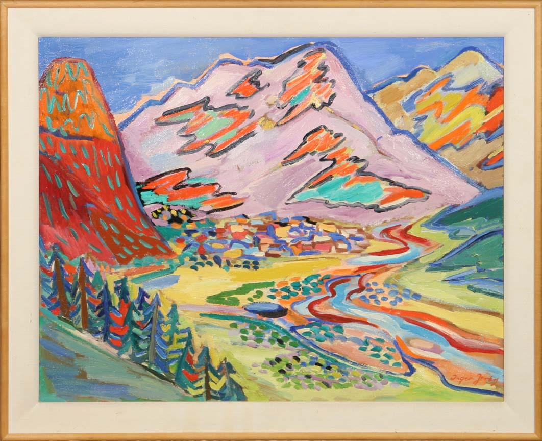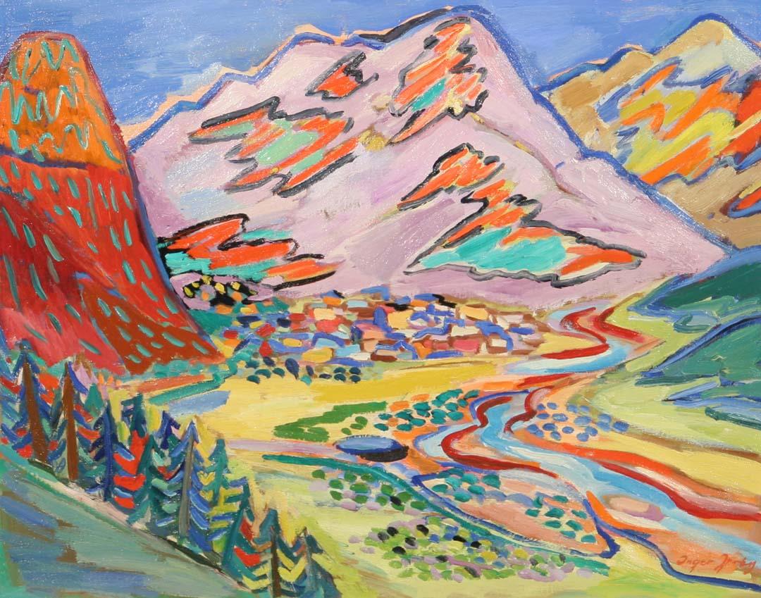 Inger Jirby (20th-21st Cent). Silverton With Violet Mountain, 1985. 24" x 30" oil on canvas. Signed lower right & verso. (est $1,000-2,000). For condition reports please visit: www.auctioninsantafe.com/cr2011.pdf