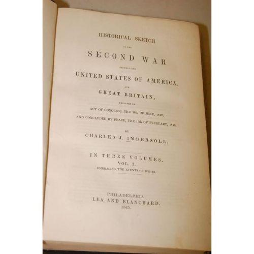 Ingersoll, Charles J.. A Group of Two Volumes as Listed. Philadelphia: Lea and Blanchard, 8vo - over 7¾" - 9¾" tall. Hard Cover. Ex-Library. Good Condition. ***Historical Sketch of the Second War Between the United States of America, and Great Britain, Declared by Act of Congress, the 18th of June, 1812, and Concluded by Peace, the 15th of February, 1815 - Volume 1 Embracing the Events of 1812-13 (1845). 1 leaf of advertising, vi, 13-515pp, [1] 16pp advertising. Bound in original blind stamped cloth, bumped/worn corners, loss to upper/lower edge of backstrip. ***Historical Sketch of the Second War Between the United States of America, and Great Britain, Declared by Act of Congress, the 18th of June, 1812, and Concluded by Peace, the 15th of February, 1815. Embracing the Events of 1814 - Volume 2 (1849). iii-viii, 17-317pp. Double column format, in a library binding. Both volumes have binding & hinges tight.