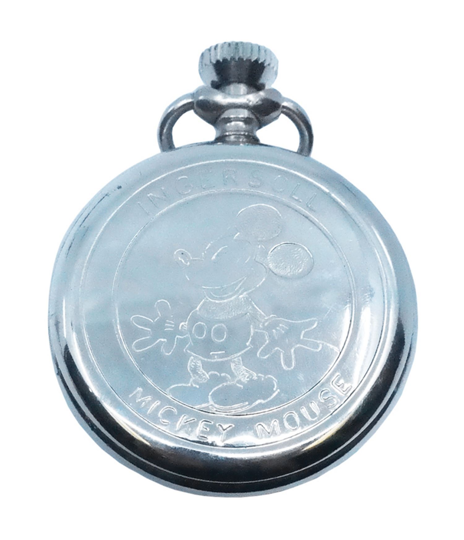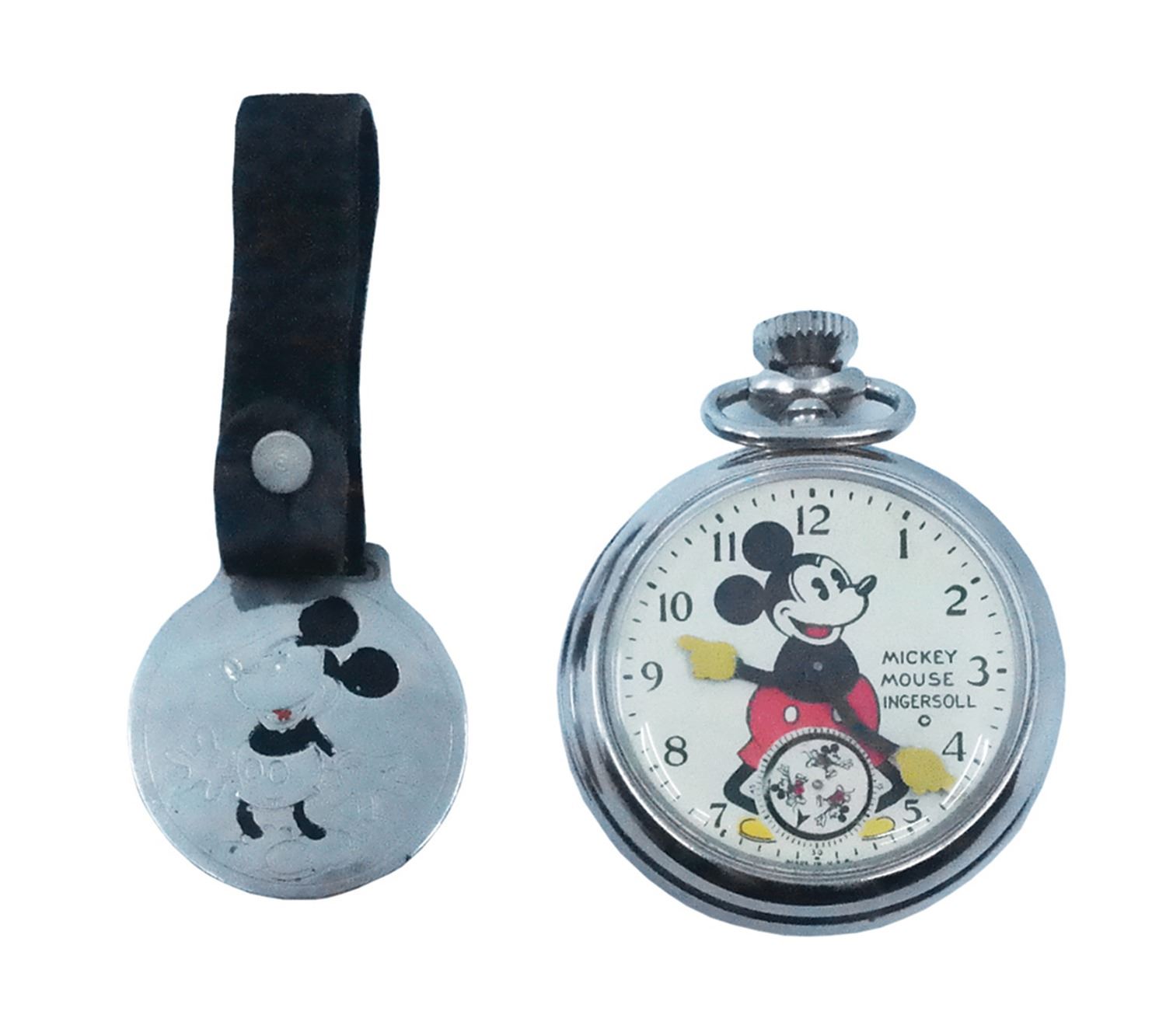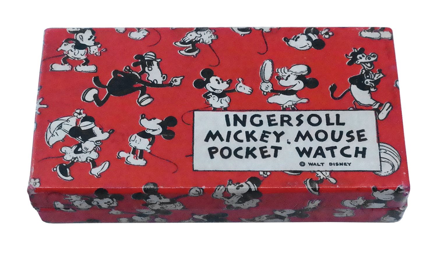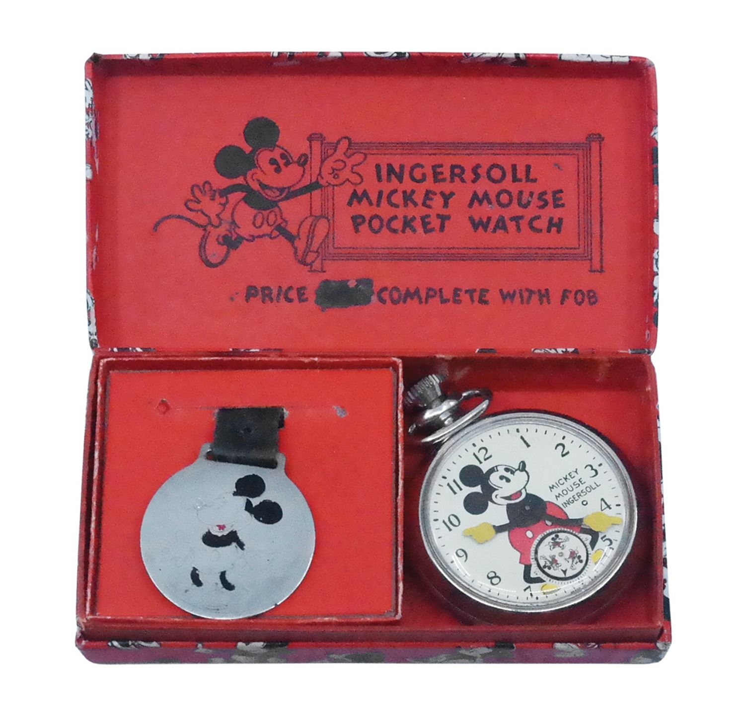 (Ingersoll, 1934) An early Ingersoll Mickey Mouse pocket watch complete with fob. Mickey's appeal was worldwide, and the studio capitalized on it through Kay Kamen and his army of licensees. This 2" diameter silvered brass case pocket watch is the second version produced, and was marketed in England. The watch has moderate wear from use, but overall is in very good functioning condition. The original box and fob are worn but still exhibit well. It is extremely difficult to find the watch, box and fob still together.