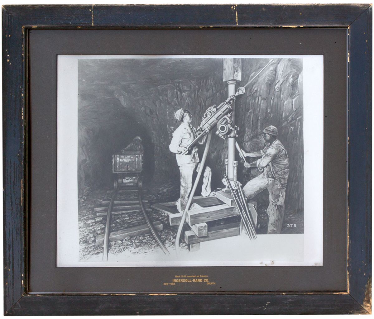 c1920s - This 18" x 17" black and white illustration is an early Ingersoll-Rand advertisement. The ad depicts two men operating what appears to be a large hammer drill, while a third figure pushes a mine cart in the background. The illustration is finely detailed, and seems like a photograph at first glance. This illustration is noted "378" in the lower right corner, and may have been part of a larger print that included advertising text and a description of the tool and company. Even cropped, this ad is impressive in its 29.5" x 26" frame and black matting. In 1871, Simon Ingersoll founded Ingersoll Rock Drill Company in New York. In 1905 Ingersoll-Sargeant Drill Company merged with the Rand Drill Company to form Ingersoll Rand. The company persists today as a major manufacturer and distributor of mining and milling tools. -61651