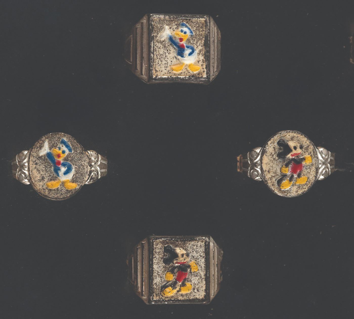 (Ingersoll, c.1948) A die-cut store display for Ingersoll's sterling silver Mickey Mouse and Donald Duck rings. The display is complete with 10 rings, and the rings come in both square and circular shapes, with images of both Mickey and Donald. The display measure 11"x8.5" and is in very good condition.