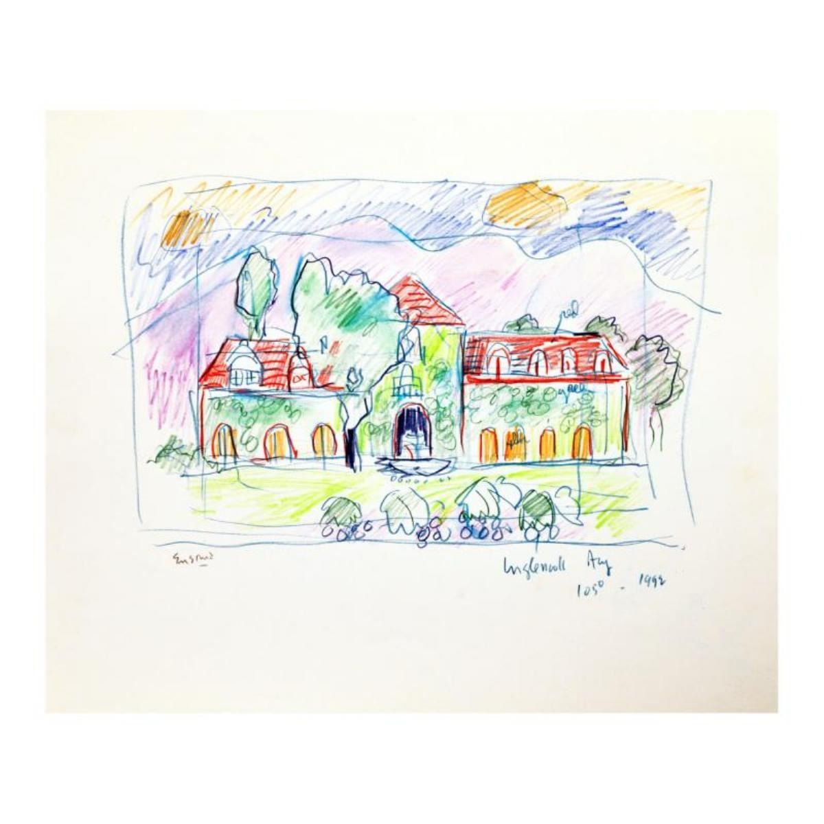 "Inglenook Winery, Napa Valley" is an original Mixed Media on Paper by Wayne Ensrud. The piece is hand signed by the artist and comes with a Certificate of Authenticity. Measures approximately 14" x 17".