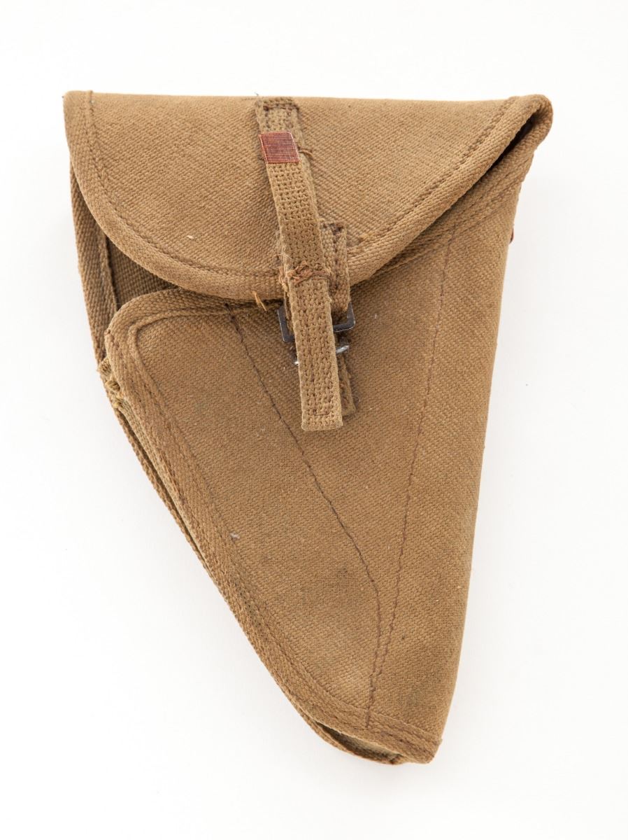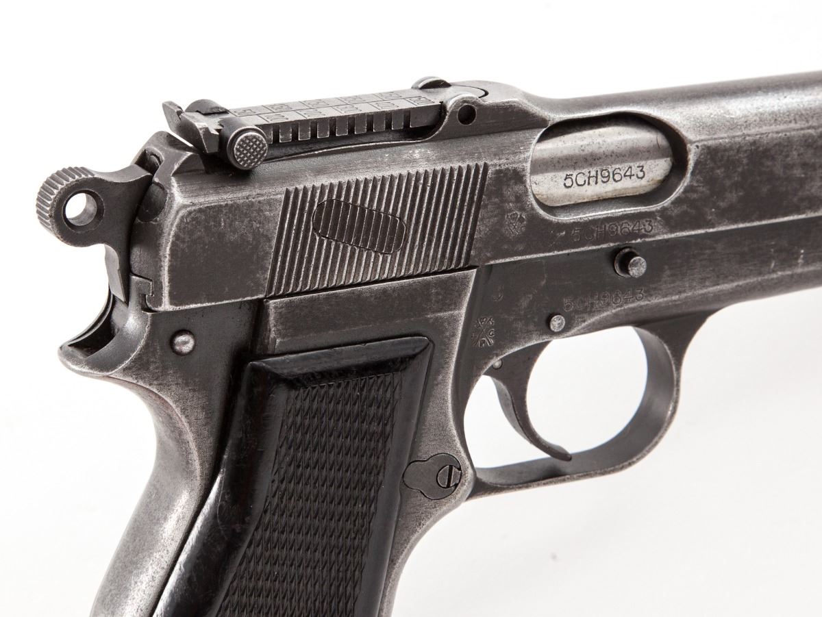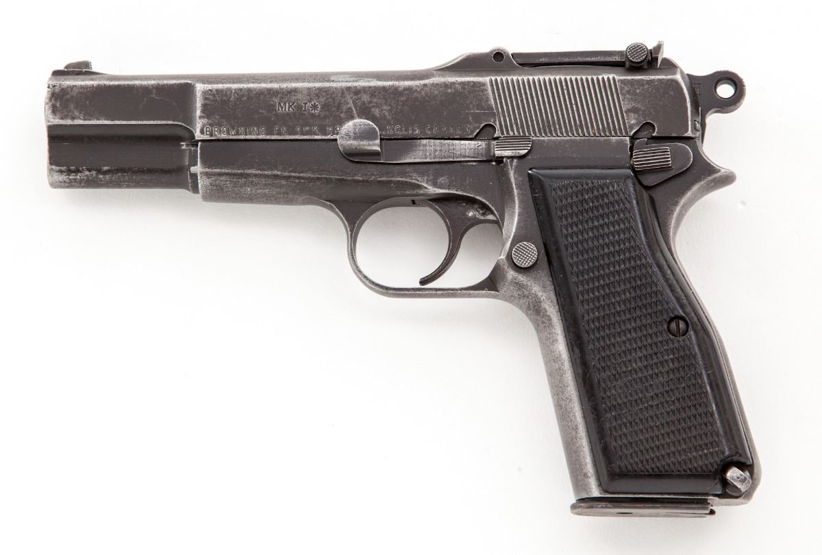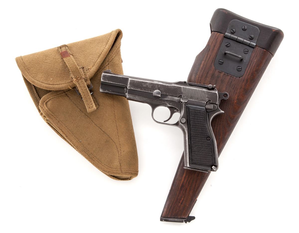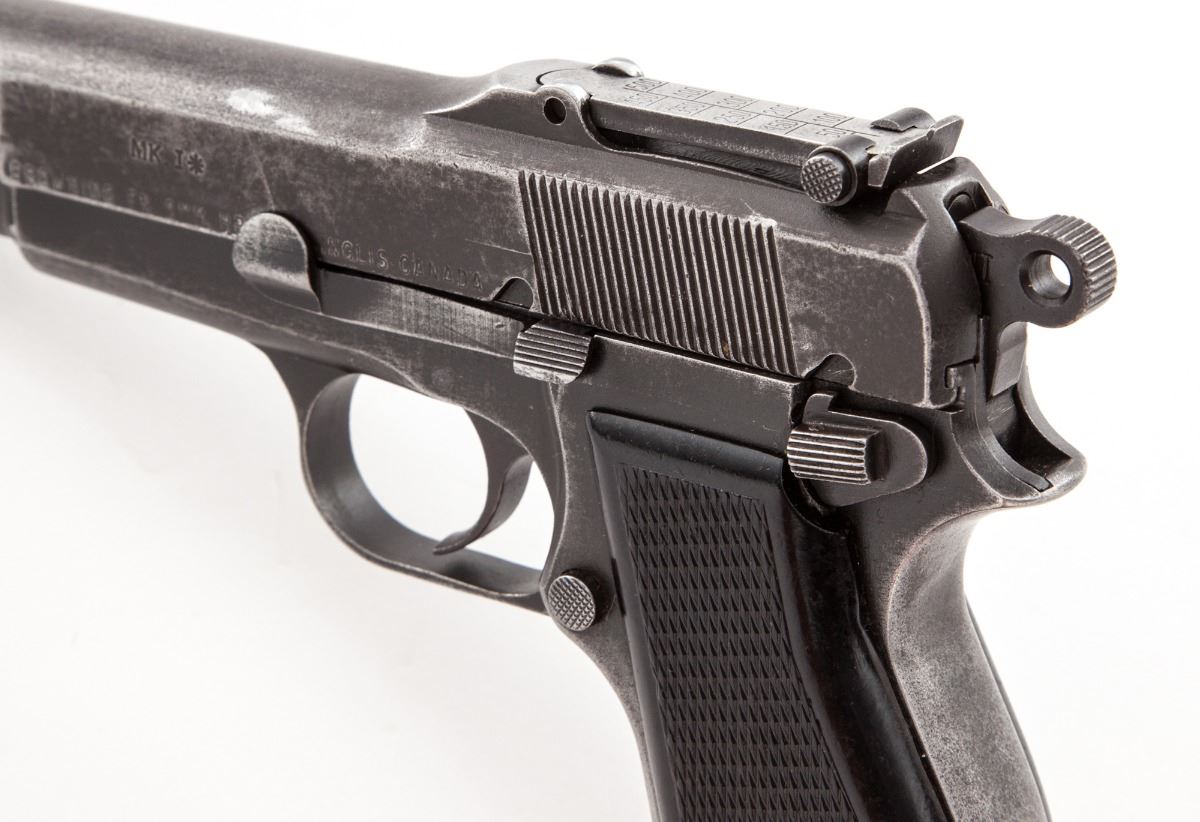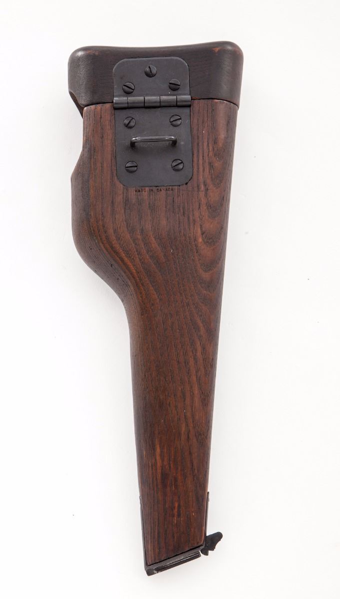 Inglis MK I* Semi-Automatic High Power Pistol, #5CH9643, 9mm, 4-3/4'' barrel, black oxide finish, factory checkered black hard rubber grips, tangent rear sight (50-500), slot for shoulder stock, with one Inglis magazine, 1945 dated Canadian marked canvas holster, and one wooden combination shoulder/holster stock marked ''SA Ltd/1945'' as well as ''Made in Canada'' below hinge.  Condition is very good retaining approx. 80% finish.  Grips with light to moderate flattening.  Action is good, bore is very good.  Canvas holster appears near new.  Combination shoulder/holster stock may be a later made reproduction dating from the 1980s.  Est.:  $1,000-$1,500.  (C&R/PPT)