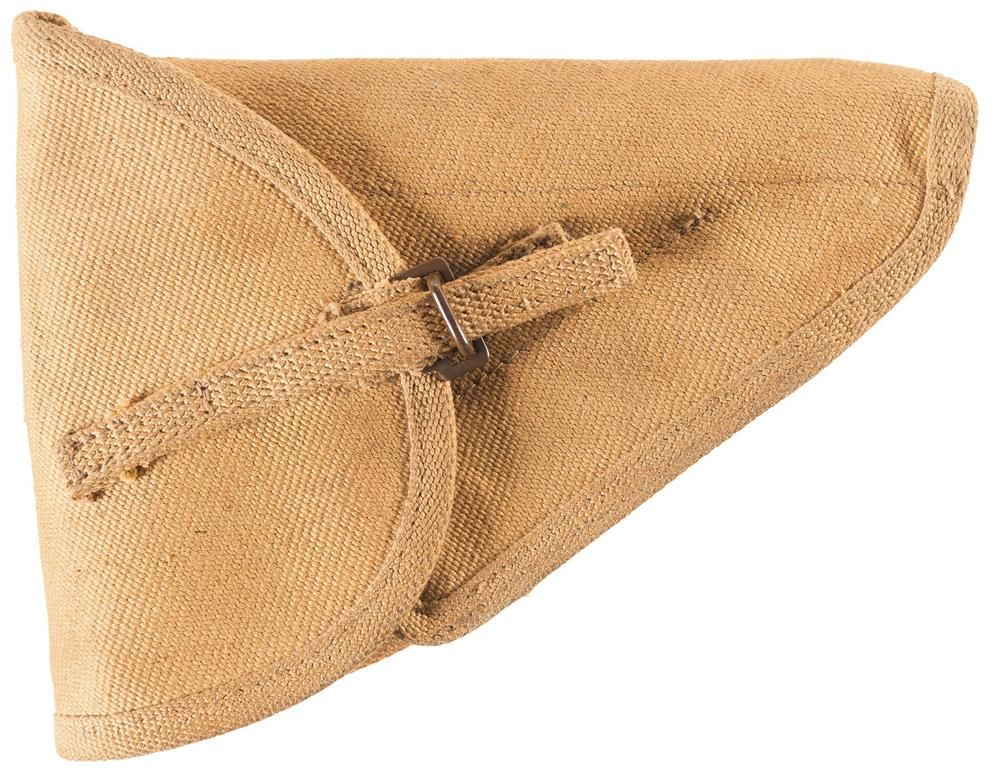 Tangent rear sight and slotted back strap, with the two line maker's marks on the left side of the slide and stacked serial numbers on the right. Crossed pennant marks are present on slide, barrel and frame, with Canadian "arrow in C" stamps on the frame, traces of the Canada maple leaf decal on the front strap, and checkered grip straps. With a tan canvas flap holster, marked with the Canadian "C in arrow" and "Z.L. & T. Ltd. 1944" inside the flap, and an extra magazine. Both magazines are hand-stamped to match the pistol.