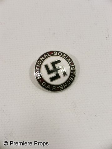 This is a prop Nazi round pin from the Quentin Tarantino war epic 'Inglorious Basterds' (2009). The pin features a black swastika in the center, inside a black circle with 'National Sozialistiche D.A.P.' engraved around it.
