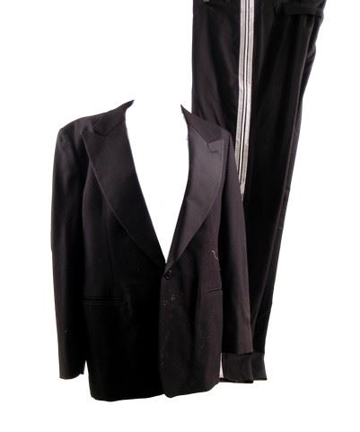 Usher's bloody with bullet holes, black jacket with bullet holes and black pants with stripe on the side.
