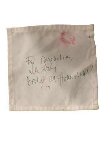 Bridget von Hammersmark (Diane Kruger) screen used for autograph, white cloth napkin with 'Fur Max, Alli Liebe, Bridget von Hammersmark' signed on the front with a liptstick kiss. (approx. 6 1/2" x 6 1/2")