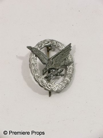 A prop pin from Quentin Tarantino's 2009 epic film Inglourious Basterds. The pin is made out of metal and shows an Eagle affixed to a metal circular backing, clutching lightning bolts over a Nazi Swastika.