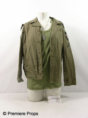 Pfc. Simon Sakowitz (Carlos Fidel) screen worn, hero, faded green button and zipper up the front, patches on the sleeves, military jacket, (size 38R) faded green cotton tank top vest, and two metal dogtags with beaded necklace. Includes wardrobe tag!