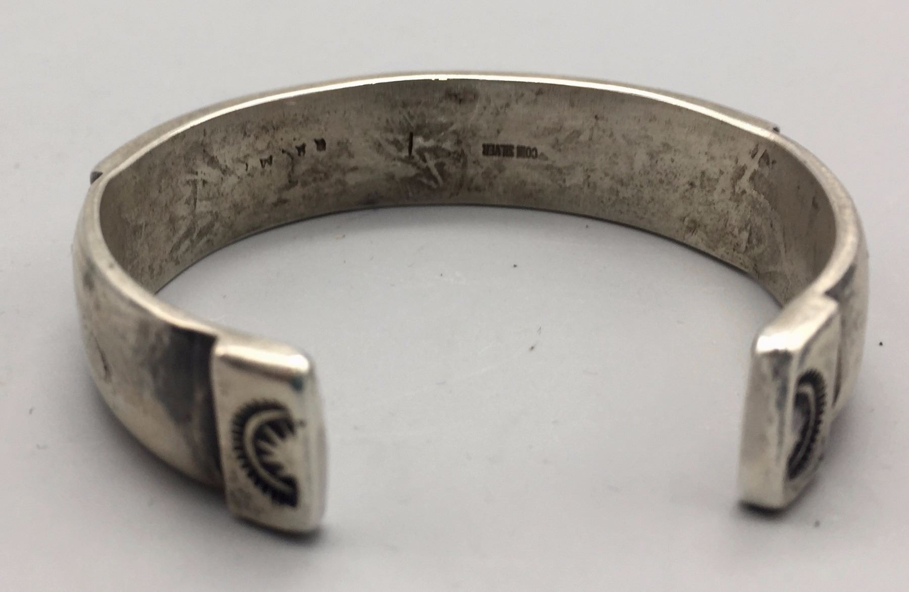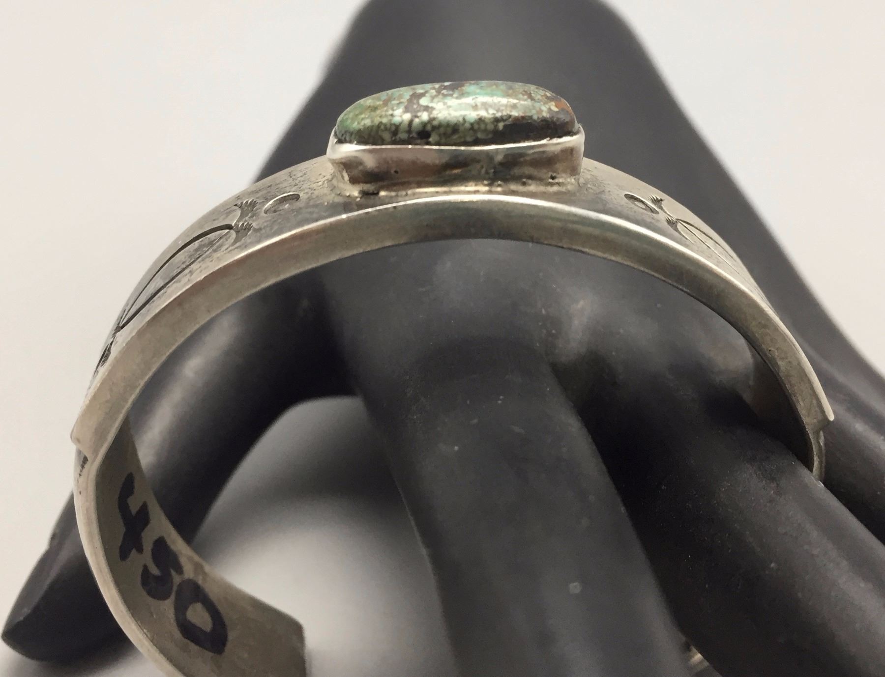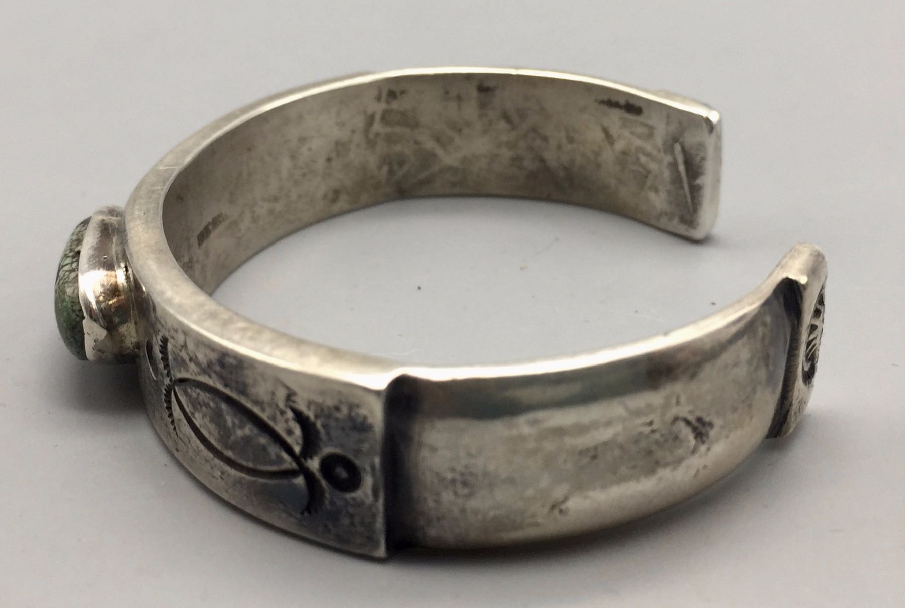 Maker: Red Rabbit. Marked R.R.M.F. Approx. Age: Contemporary. Size: Measures 5” inside, plus there is a 1” opening (making it fit an approx. 6” wrist). It is 5” wide and weighs 51.5g. Condition: Good. Additional Info: A turquoise setting in coin silver. Completely handmade and hand-forged. Please look closely at the pictures - they are an important part of our description. Shipping: There will be a $5 handling / packaging fee for shipping this lot. The actual cost of postage will be added on top of that.