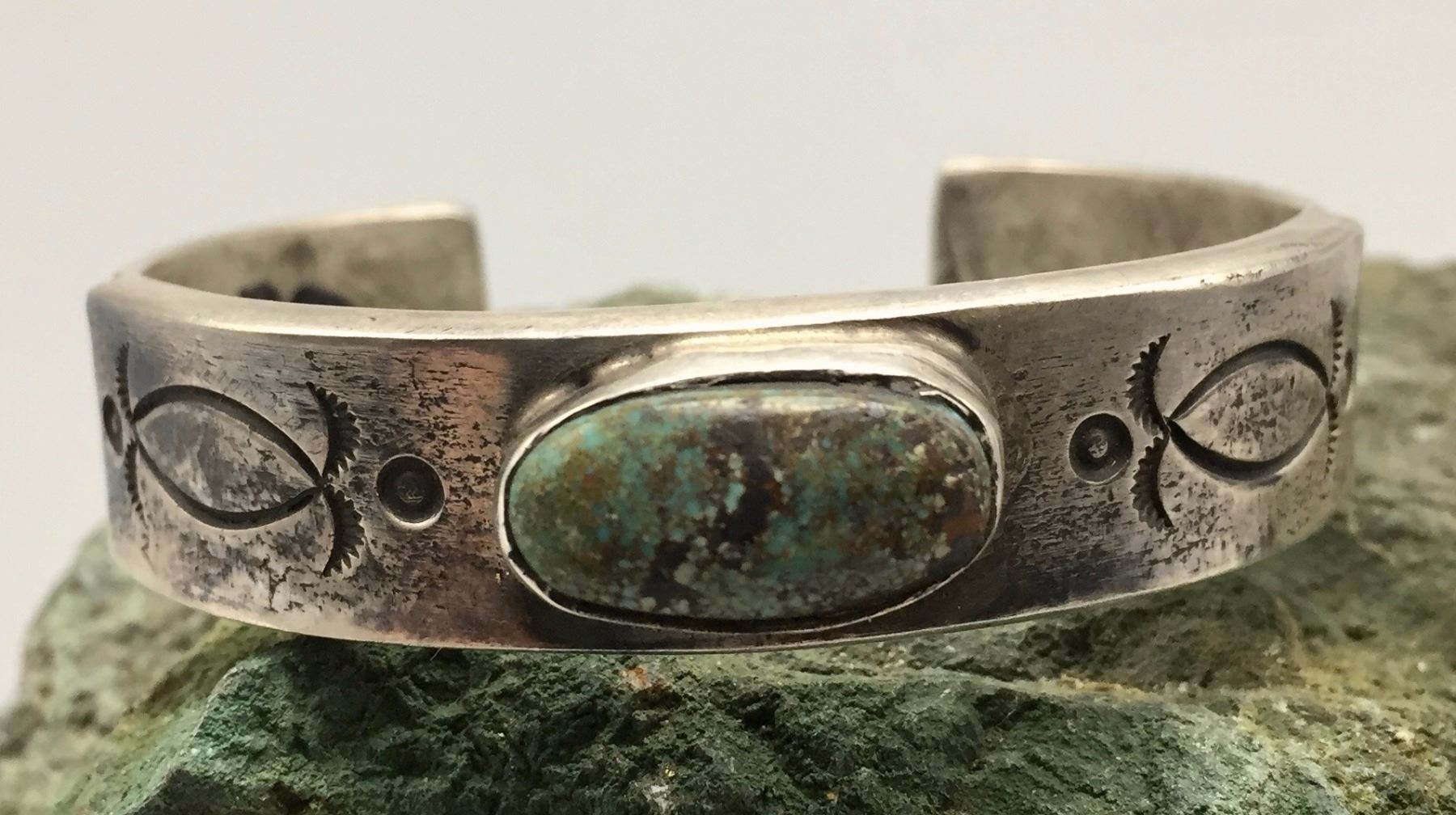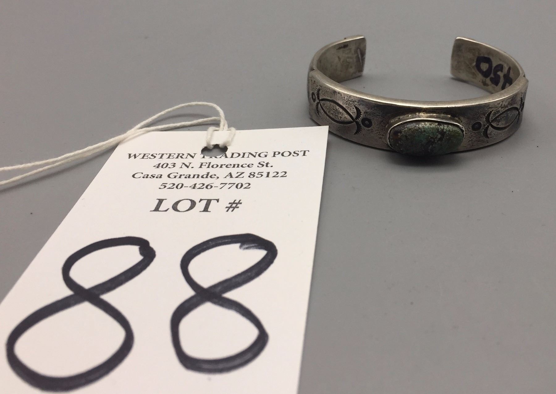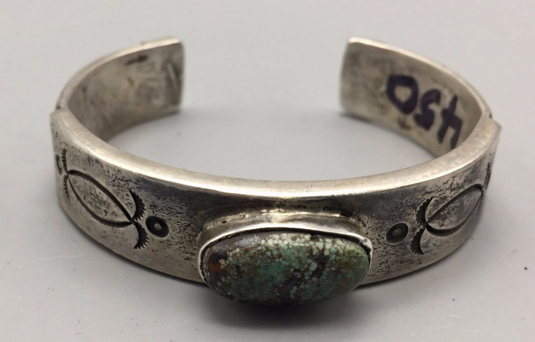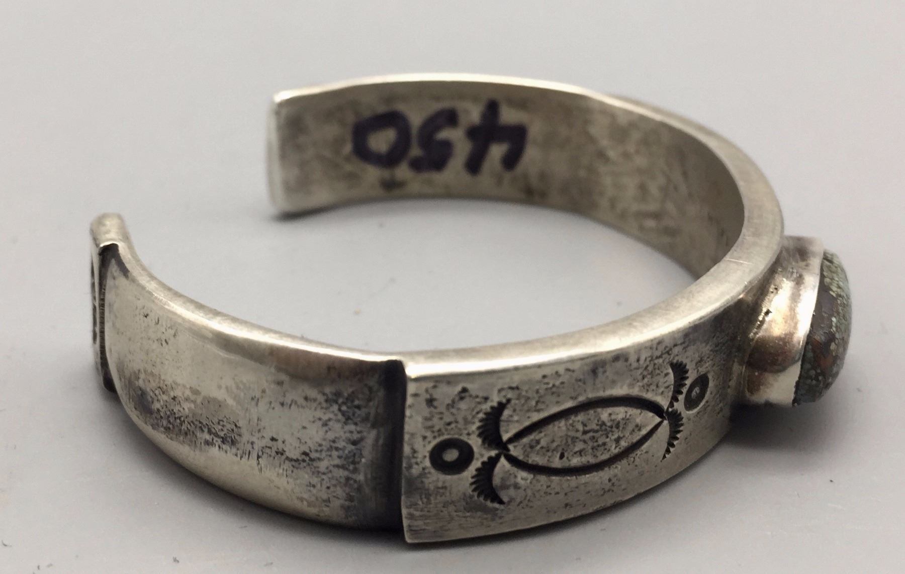 Maker: Red Rabbit. Marked R.R.M.F. Approx. Age: Contemporary. Size: Measures 5” inside, plus there is a 1” opening (making it fit an approx. 6” wrist). It is 5” wide and weighs 51.5g. Condition: Good. Additional Info: A turquoise setting in coin silver. Completely handmade and hand-forged. Please look closely at the pictures - they are an important part of our description. Shipping: There will be a $5 handling / packaging fee for shipping this lot. The actual cost of postage will be added on top of that.