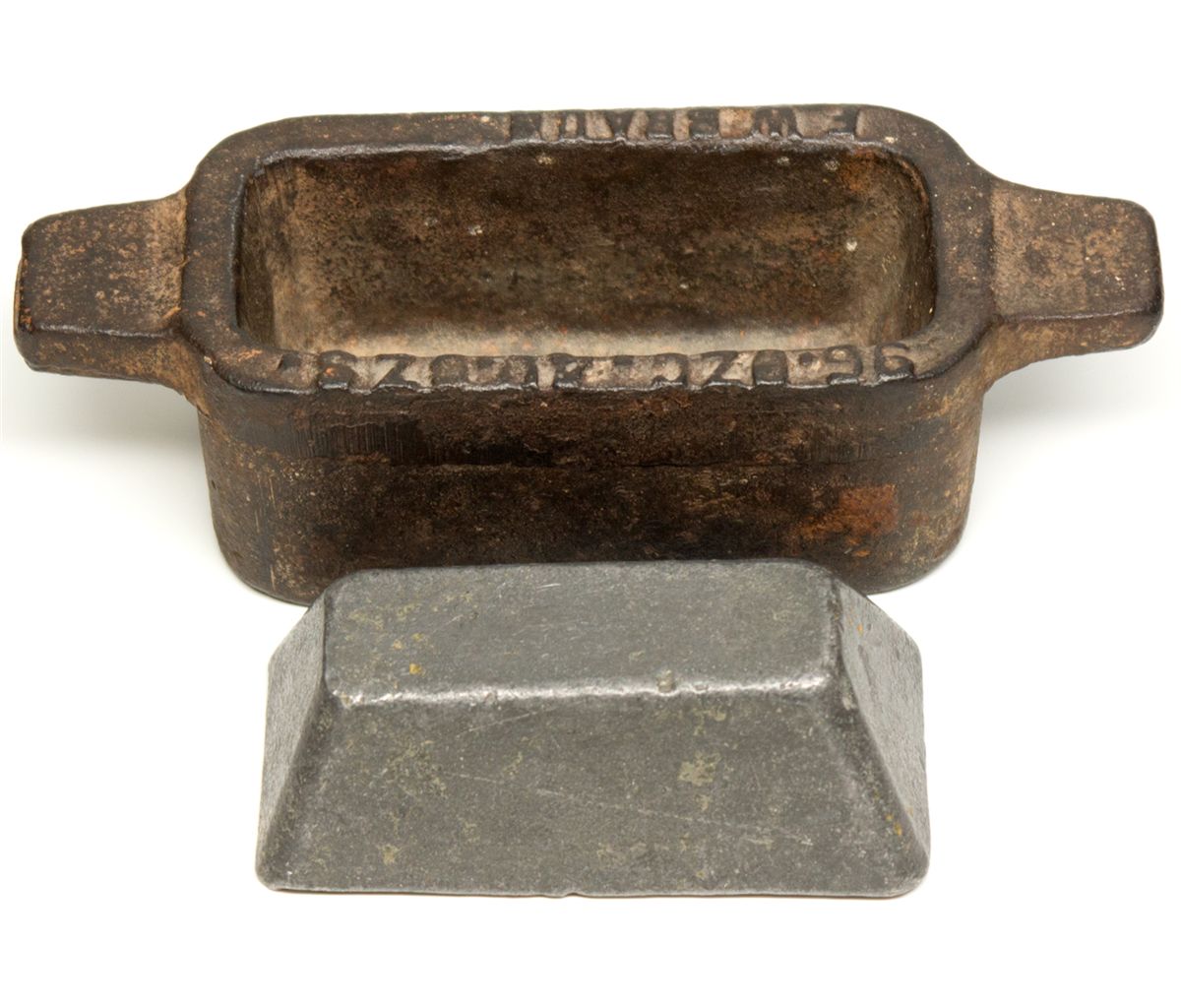 Lot of 2. F.W. Braun cast iron ingot mold marked with his name on the top rim. On opposite rim is: 96.OZC.AU.OZS. Measures 2.5” x 4.5” long excluding a 1” “handle on each end, and is 2”tall. The lead ingot is trapezoidal with the bottom area smaller than the top area. Top measures 2” x 4” and bottom measures 1” x 3.” Height is approximately 1.5.” F.W. Braun placed an ad in Mines and Minerals Magazine in 1901 for ore crushers and pulverizers used in assaying work. This may be the same man who worked with Lucien Brunswig in the pharmaceutical business around this same time and in the same area. - Jacobitz Collection -60237