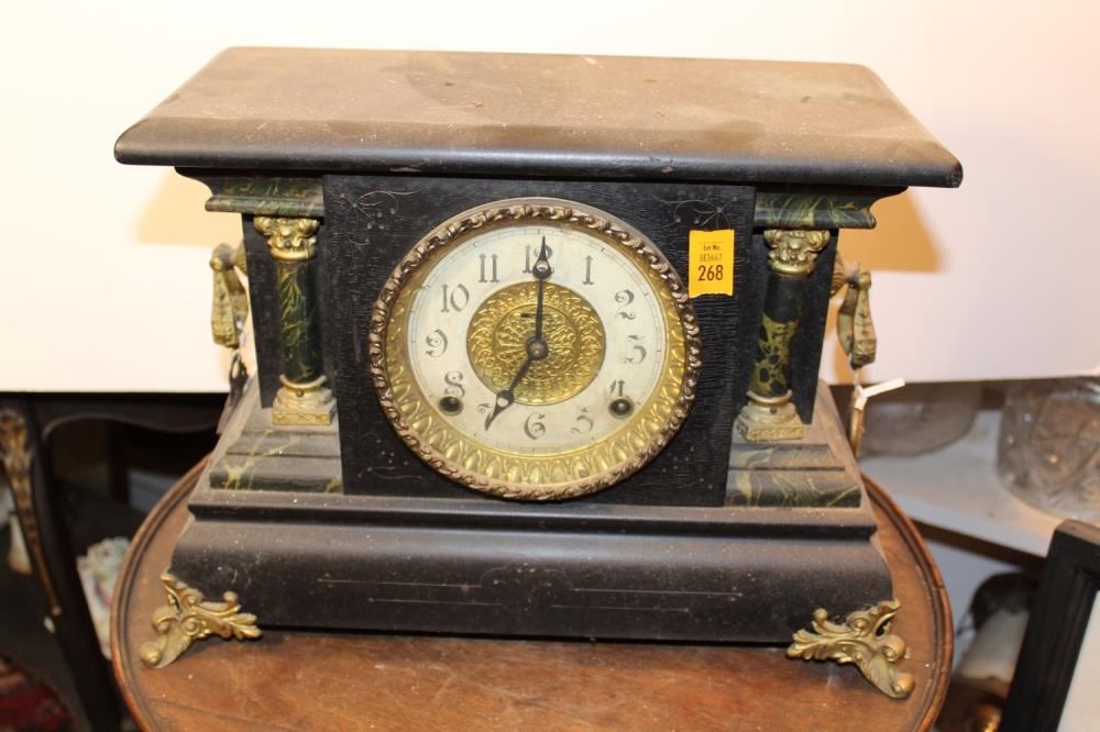 Black Mantel Clock with key. Approx. 14 inches tall x 11 inches wide x 6 inches deep.