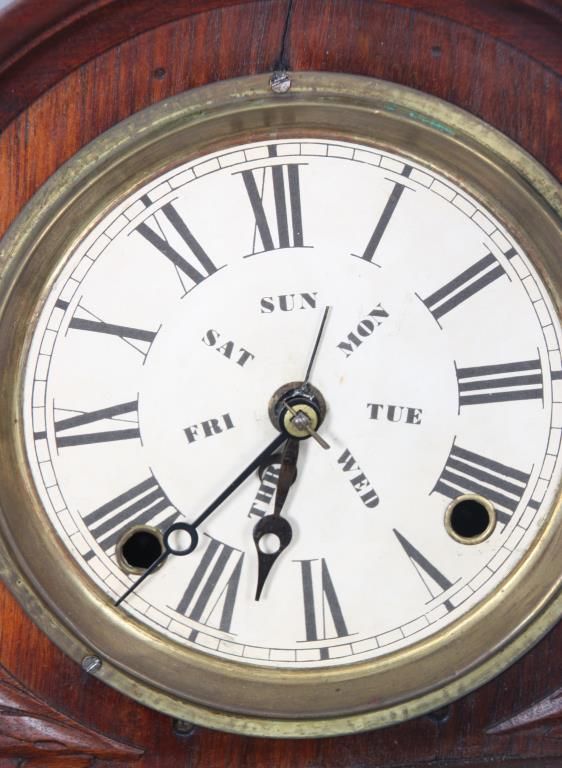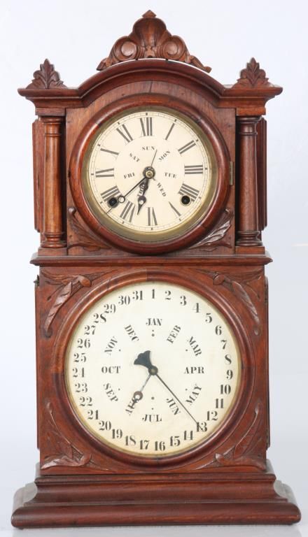 Ingraham Walnut Double Dial Calendar Shelf Clock. Original 6 in. paper time dial has black Roman hour numerals with days of the week inside and blued pierced spade hands; spring driven 8 day movement has silvered plates signed E. Ingraham & Co. B.B. Lewis’ patented perpetual calendar mechanism has an 8 in. paper dial with black 31 date numbers and month indicator inside, in good running condition. 2 tier carved walnut case with filigree carved crest, side finials, turned columns, leaf carved corner pieces and raised panels on the sides; in good condition, refinished. 22.25 in. high x 12.5 in. wide x 5.5 in. deep.