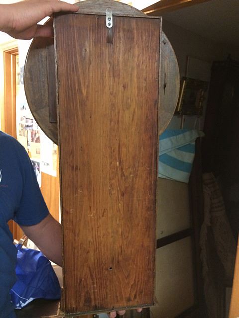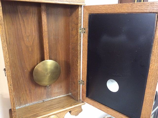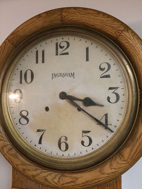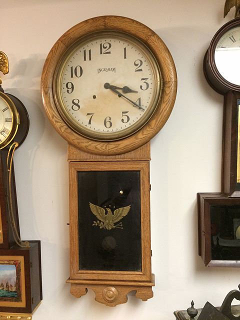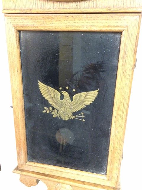 Ingraham Clock Co. Oak Regulator clock with gold eagle on glass, uncommon model, carved base, "Ingraham" on dial.