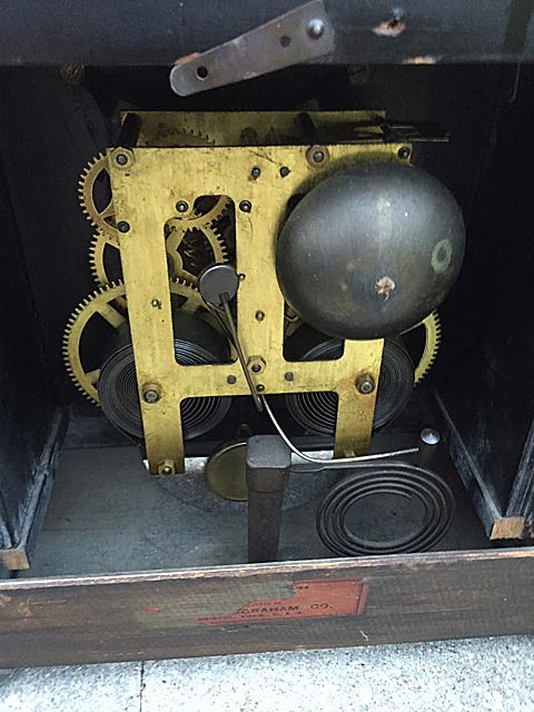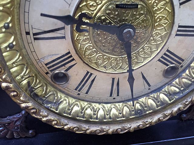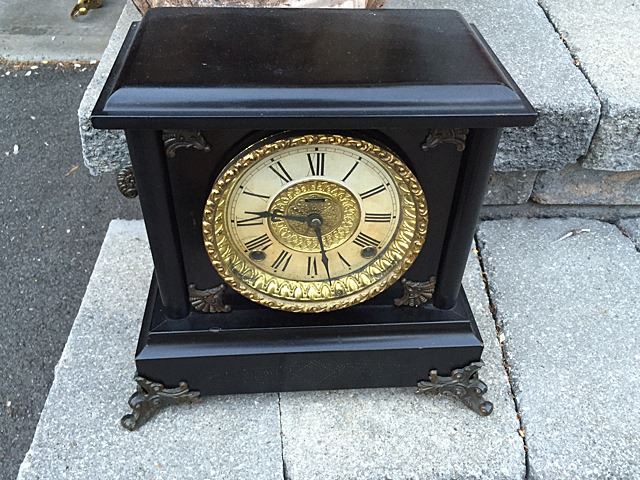Ingraham Shelf Clock key wind with beautiful, ornate dial, feet, and accents.