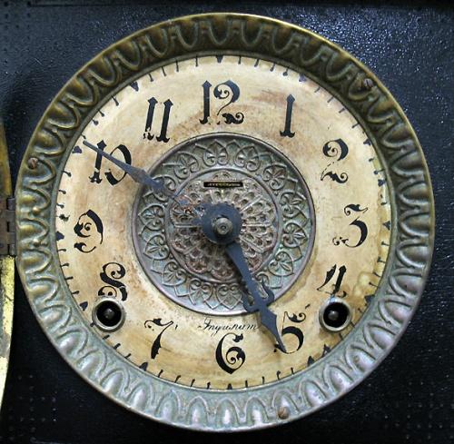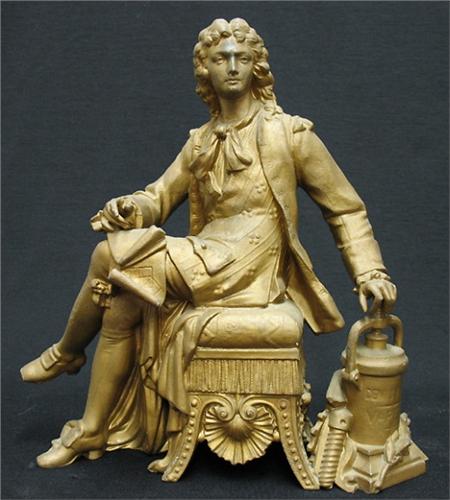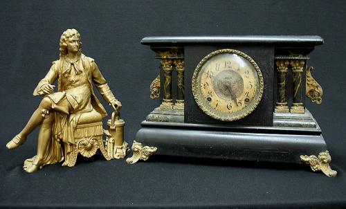 Ingraham wood cased mantle clock with gilt painted seated clock figure on top; double side columns flanking brass dial; gilt metal ormolu; C. 1900; clock measures 11" high x 17" across x 7" deep; figure measures 12" high (no visible defects)