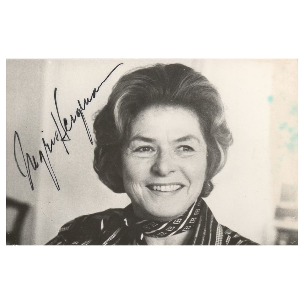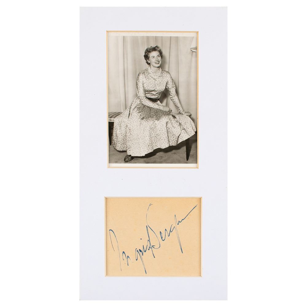Two items: a semi-glossy 5.25 x 3.5 photo of Ingrid Bergman in later age, signed in black ink; and a vintage fountain pen signature, "Ingrid Bergman," on an off-white 3.25 x 2.5 sheet that is matted with a photo to an overall size of 5 x 9.75. In overall fine condition, with a strip of toning, and speckled staining, to the right edge of the signed photo.