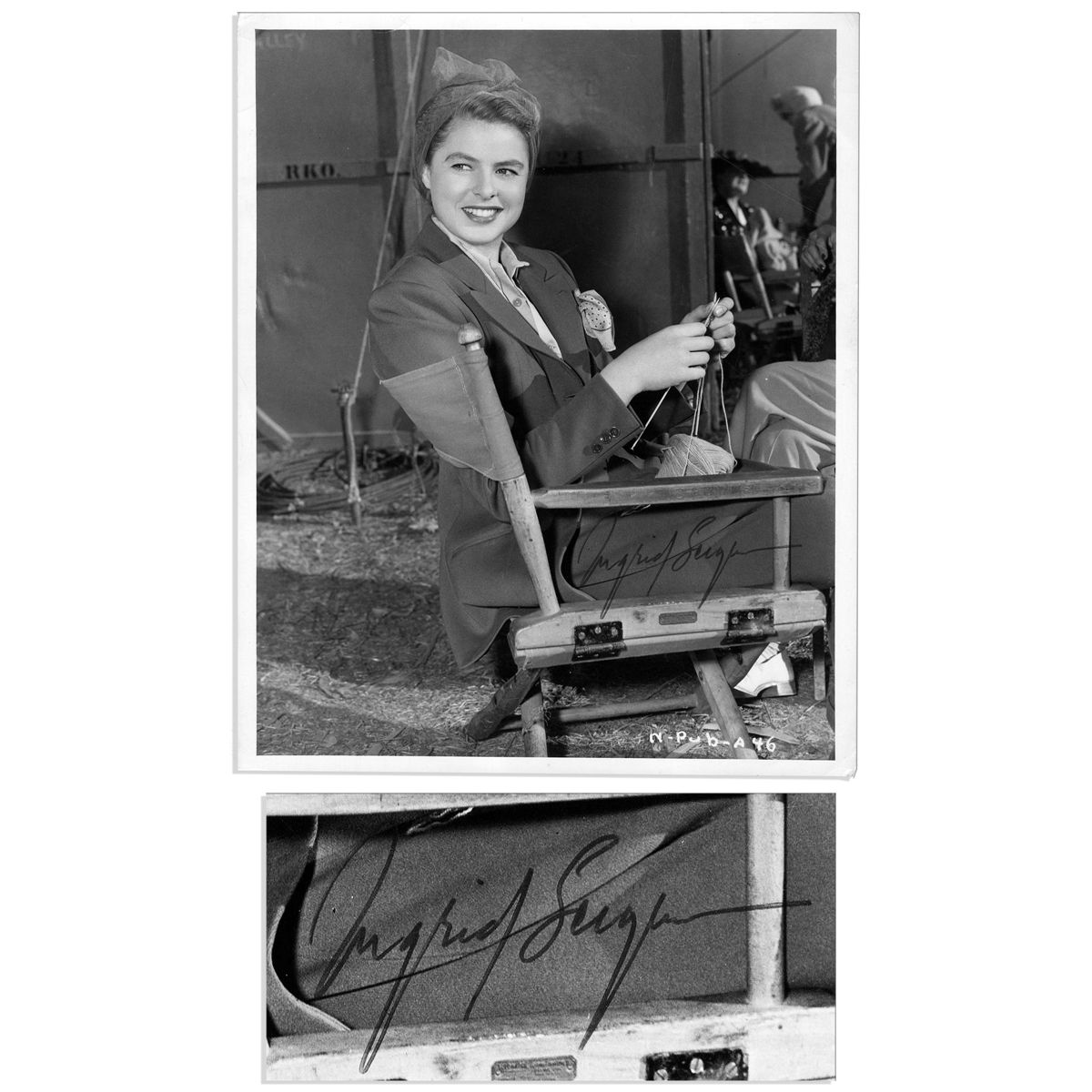Ingrid Bergman photo signed clearly in blue with full signature. The picture captures Bergman knitting between takes on the set of Hitchcock's 1946 film ''Notorious,'' the blockbuster in which she starred opposite Cary Grant. A note on verso reads, ''Autographed by Ingrid Bergman in March 1981''. Black and white glossy photograph measures 8'' x 10''. Near fine.