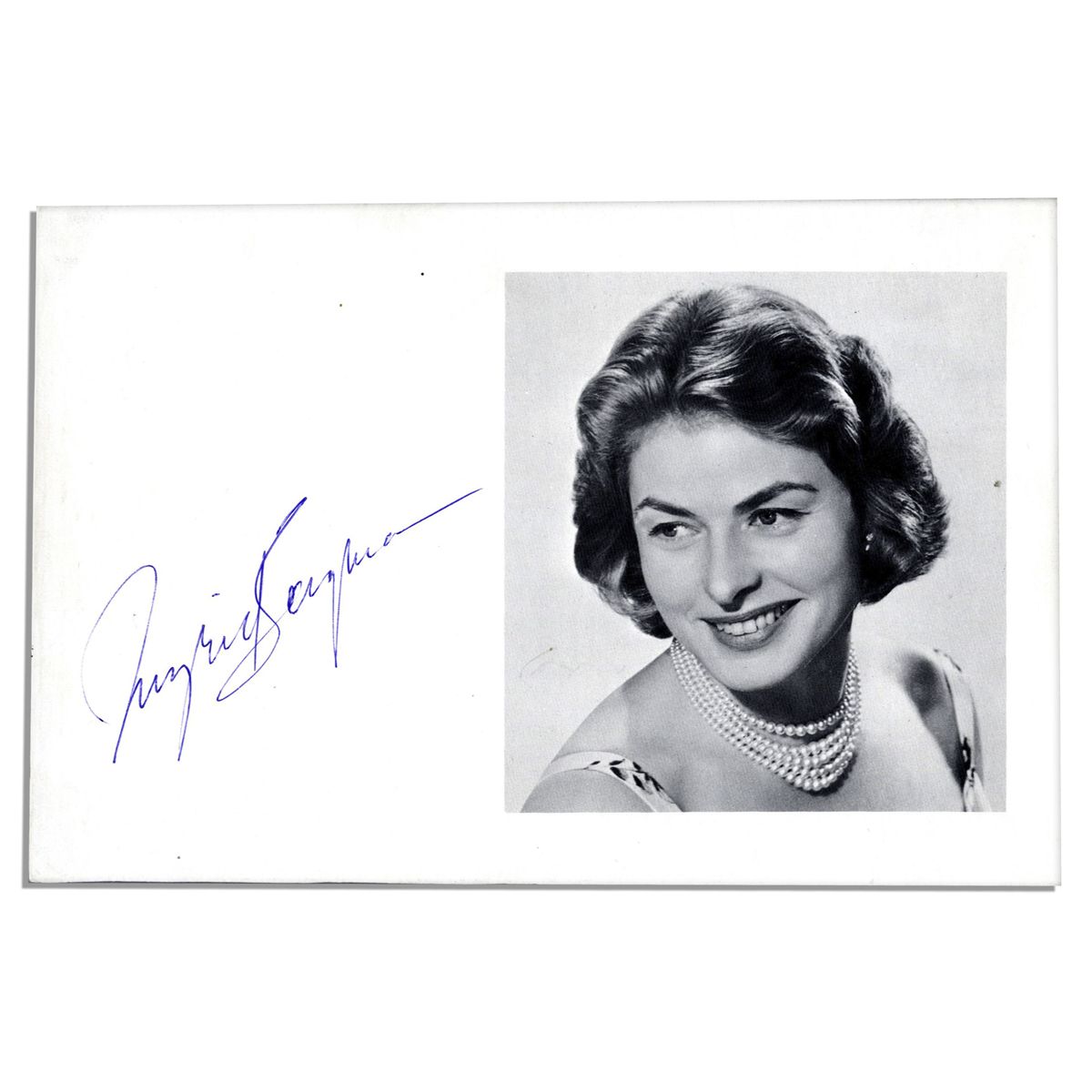 Bust portrait photo of Ingrid Bergman signed on the large border to the left, ''Ingrid Bergman''. Flat paper photo card measures 8'' x 5.25''. Adhesive remnants to corners on verso, else near fine.