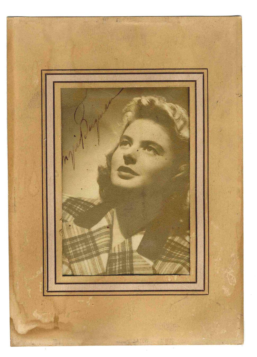 Ingrid Bergman signed photo. Black ink signature to upper left corner remains clean and bright. Photo is attached to matting along top edge with tape. Image itself measures 3.5” x 4”, matting measures 5” x 7”. Photo shows foxing and toning throughout. Edges faded from previous framing. Overall good condition.