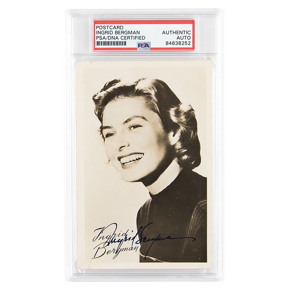 Vintage glossy 3.5 x 5.5 postcard photo of Ingrid Bergman in an attractive head-and-shoulders pose, signed at the bottom in fountain pen. In fine condition. Encapsulated in a PSA/DNA authentication holder.