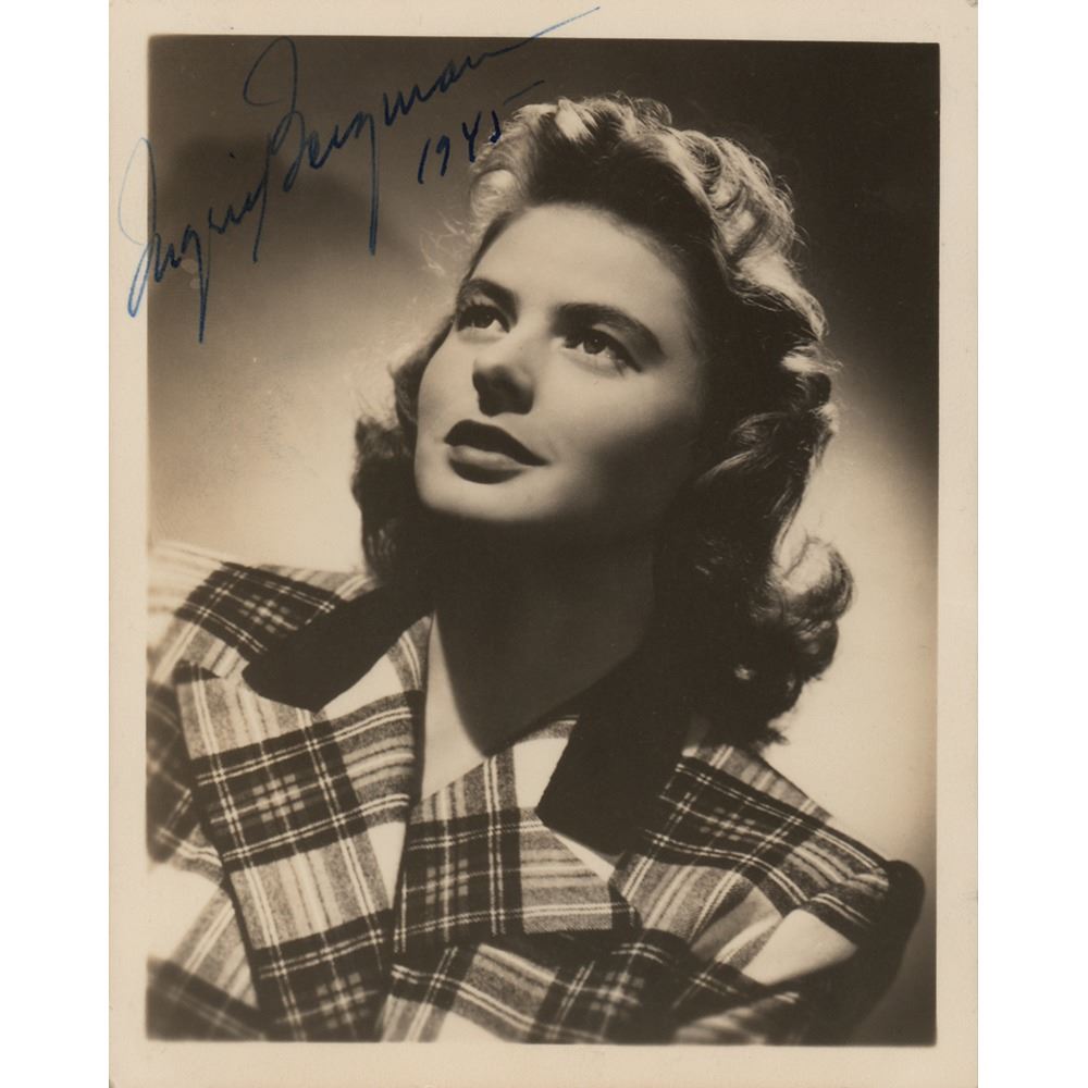 Vintage matte-finish 4 x 5 photo of the Swedish actress wearing a plaid dress coat, signed in fountain pen, "Ingrid Bergman, 1945." In very fine condition. The autograph dates to the year Bergman starred in two critically acclaimed films: Alfred Hitchcock's Spellbound and The Bells of St. Mary's, the latter for which she received her third Oscar nomination.
