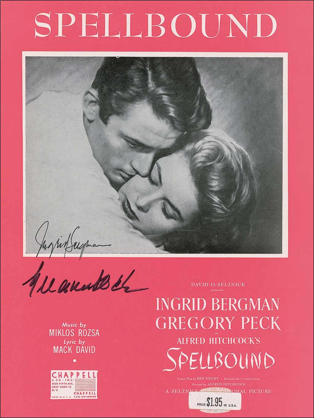 Sheet music of the song “Spellbound,” from the Alfred Hitchcock film of the same name, 9 x 12, five pages, signed on the front cover in black felt tip by Ingrid Bergman and Gregory Peck. In fine condition, with some light handling wear, and a price label to front cover.