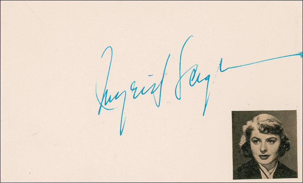 Vintage ink in-person signature, “Ingrid Bergman,” on an off-white 5 x 3 card with a small clipped photo affixed to lower right. In very fine condition.