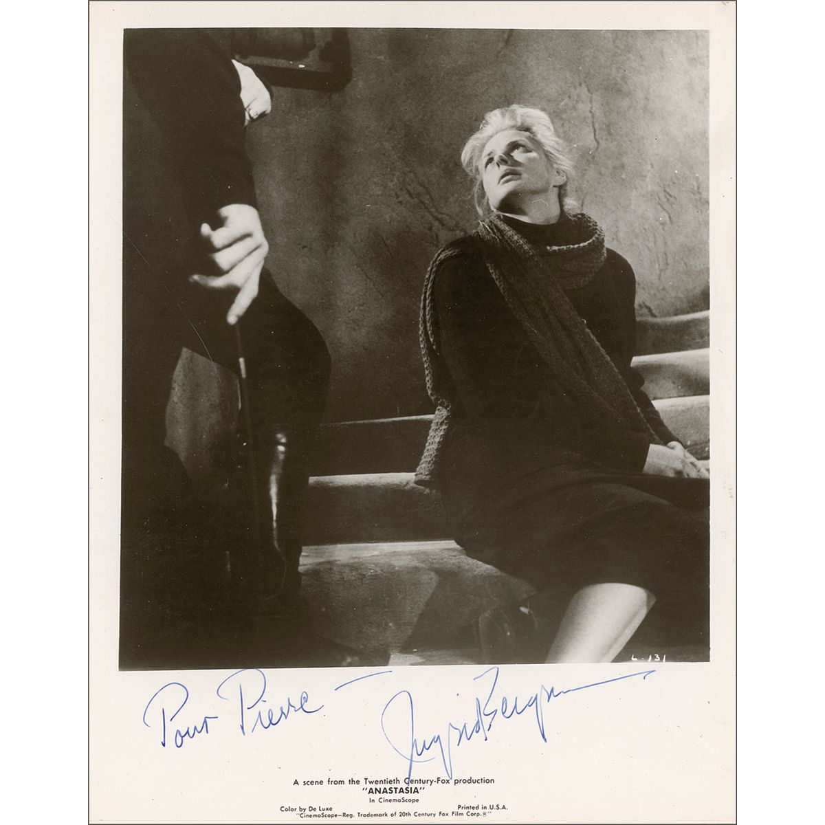 Glossy 8 x 10 20th Century Fox promotional photo for Anastasia, signed and inscribed in blue ink “Pour Pierre—Ingrid Bergman.” Scattered creases and surface marks, otherwise fine condition.