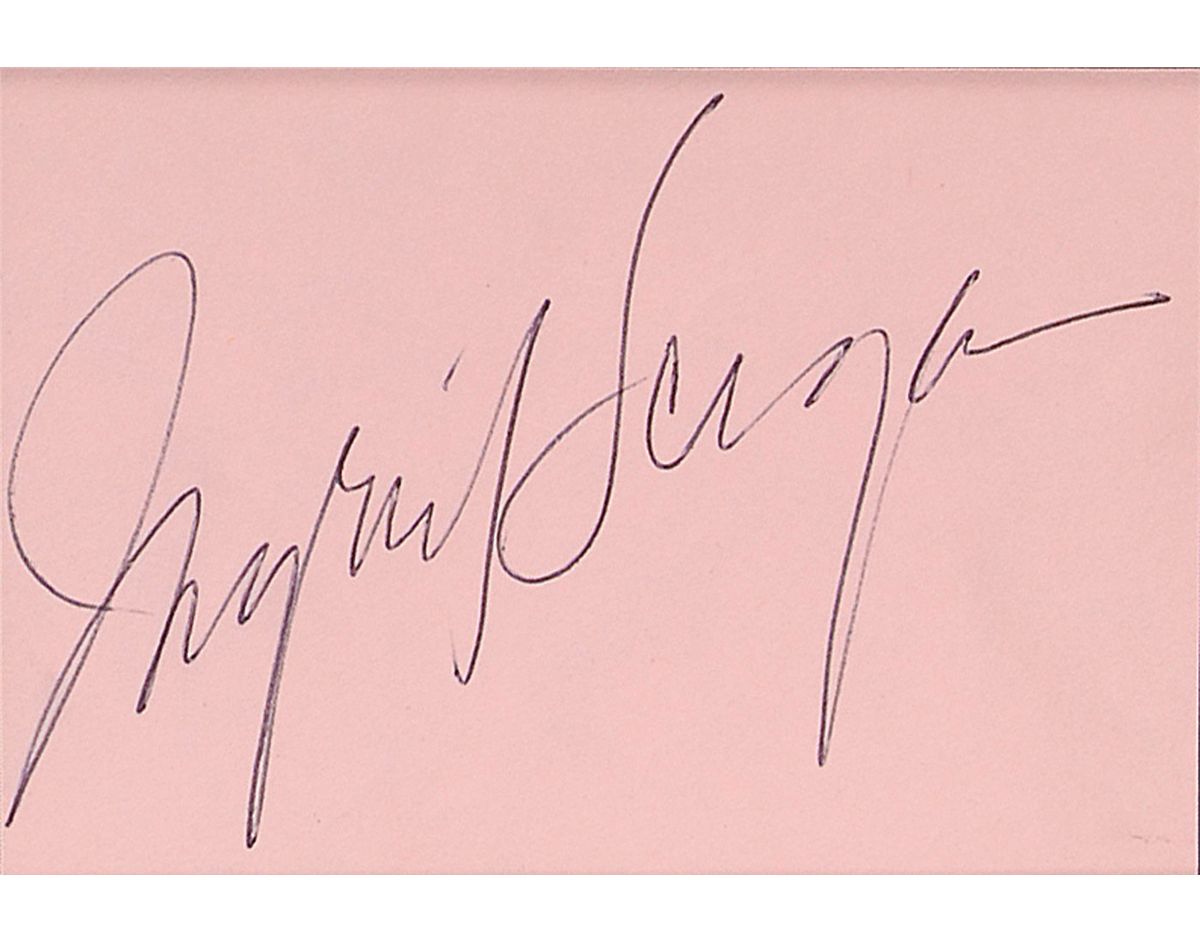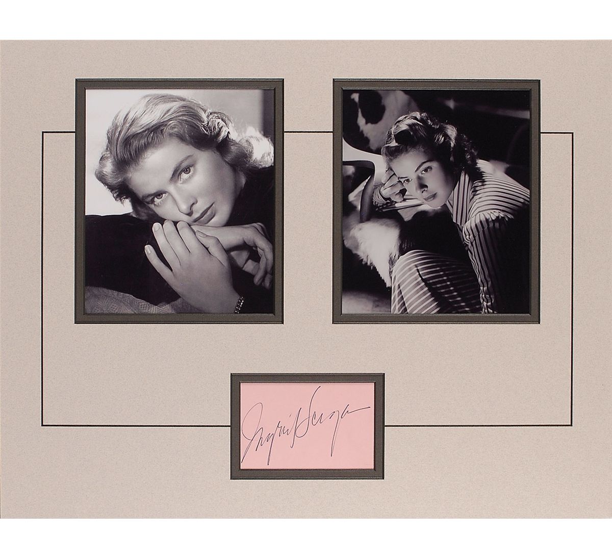 Ballpoint signature, “Ingrid Bergman,” on a pink album page. Double matted with two lovely portraits of Bergman to an overall size of 18 x 14. In fine condition.