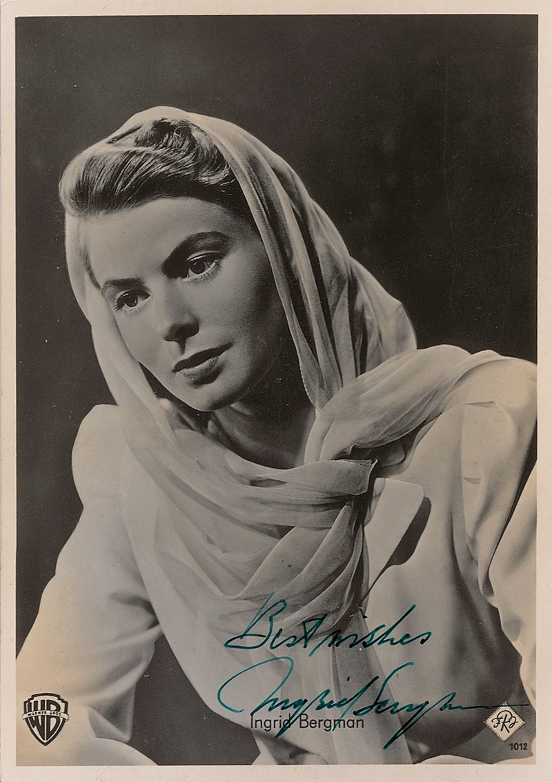 Lovely vintage pearl-finish 5 x 7.25 Warner Bros. publicity photo of Bergman from Casablanca, signed in fountain pen, “Best wishes, Ingrid Bergman.” In fine condition, with a couple light surface creases and impressions, and light silvering to dark areas of the image.
