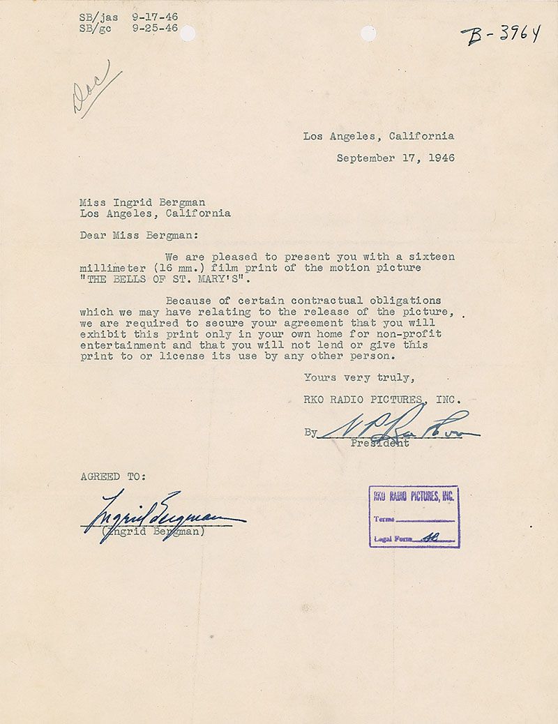 DS, one page, 8.5 x 11, September 17, 1946. Upon receipt of a “print of the motion picture ‘The Bells of St. Mary’s,’” Bergman agrees to only show it in her “own home for non-profit entertainment…and will not lend or give this print to or license its use