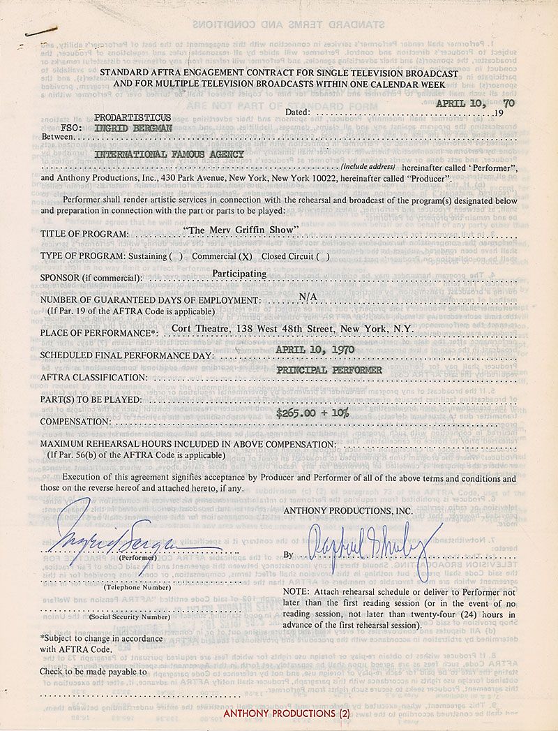 DS, one page, 8.5 x 11, April 10, 1970. Standard AFTRA contract in which Begman agrees to appear on The Merv Griffin Show on the same day in exchange for $265 plus a 10% agency commission. Signed at the conclusion in ballpoint by Bergman. A standard AFTRA rider is stapled to the main document in the upper left. In fine condition, with expected document wear.