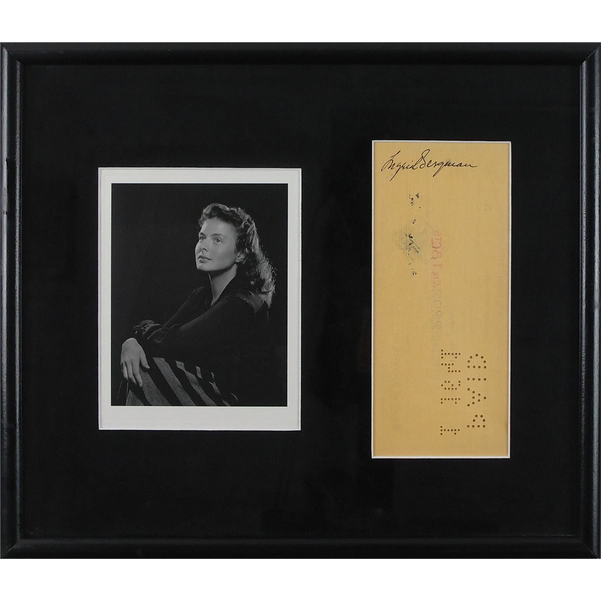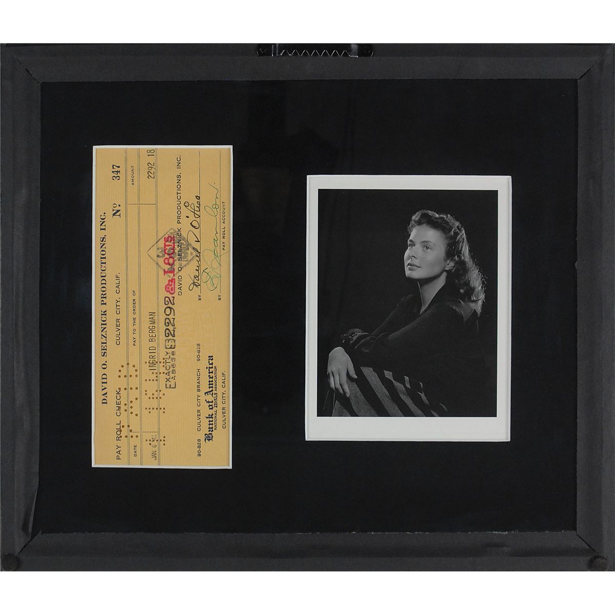 Endorsed David O. Selznick Productions business check, 7.25 x 3.5, filled out in type and signed by company employees, payable to Bergman for $2292.18, stamp-dated January 6, 1941, and endorsed on the reverse in black ink. Matted and framed, so both sides may be viewed with a photo of Bergman, to an overall size of 14.25 x 12.25. In fine condition, with expected stamps and holes, none affecting the clean signature area, and a slight brush to last name of signature.
