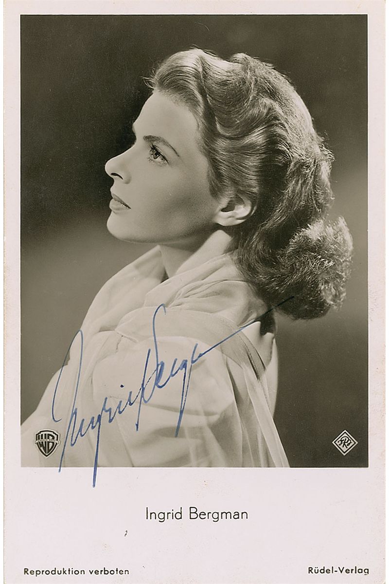 Vintage 3.5 x 5.5 German postcard photo of the Oscar winner in profile, signed on the image in fountain pen. In fine condition, with faint rubbing to emulsion and a few mild surface impressions.