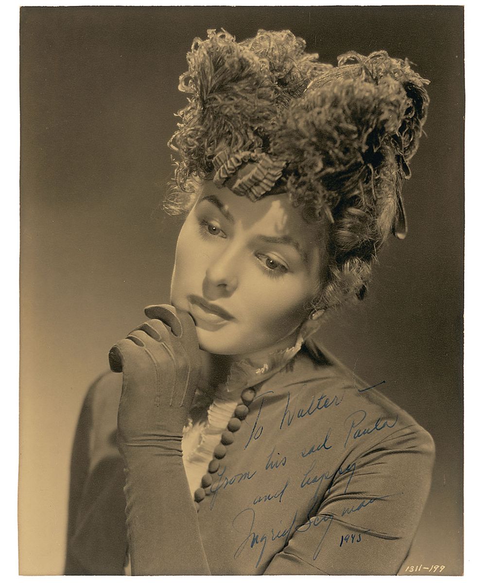 Stunning vintage matte-finish 7 x 9 photo of Bergman as she appeared as Paula Anton in her Academy Award-winning performance in the 1944 film Gaslight, signed and inscribed in blue ink to screenwriter Walter Reisch, “To Walter—from his sad Paula and happy Ingrid Bergman 1945.” In fine condition, with slightly trimmed edges. A magnificent and crystal-clear portrait of Bergman from the peak of her Hollywood career.