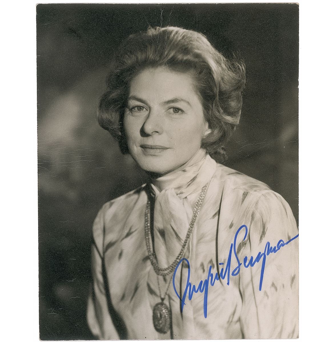 Matte-finish 4 x 5.25 photo of Bergman, boldly signed in blue felt tip. Reverse bears a 20th Century Studios copyright stamp. Scattered creasing, heaviest down center of photo, otherwise fine condition.